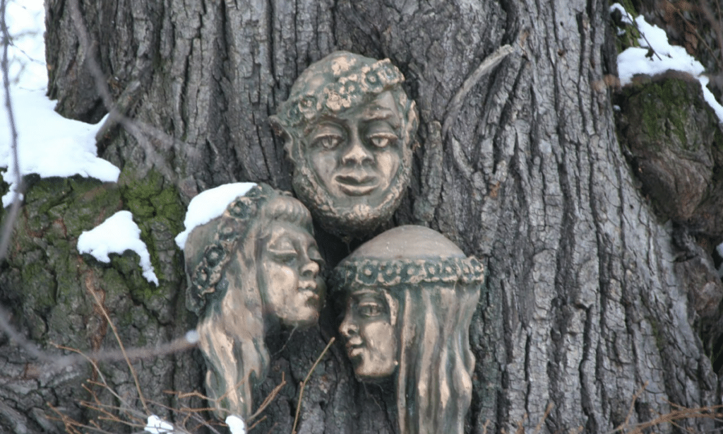 Інша палка русалка притулилася до кори розкішного клена, що біля входу у навчальний заклад. Поруч – двоє мавок, а над ними герой поеми Лесі Українки – із «Лісової пісні» Лукаш.