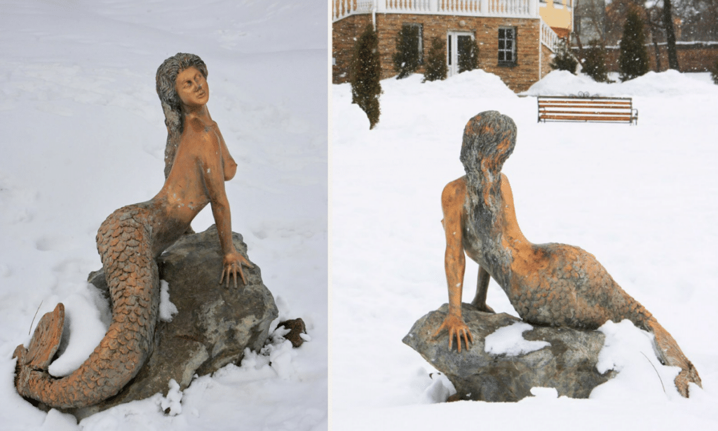 Спочатку подив: вдалині парку біля Наукової бібліотеки «Острозької академії» у снігу – заметене дівча… Та, підійшовши ближче, бачиш, що це бронзову русалку щедро обклав лютий своєю холодною білою несподіванкою.